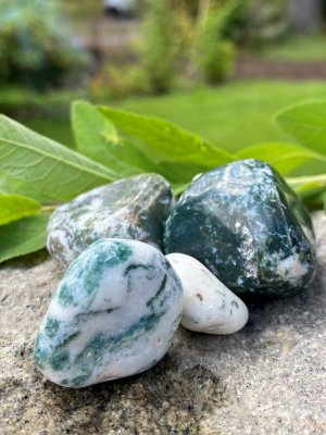 Träd agat är lugnande och verkar på hjärtchakrat. För med sig en lugnande, rogivande energi. Hjälper dig fokusera på en sak i taget, en bra sten för relationer. Stärkande och beskyddande.