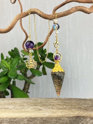 Vacker orgonit pendel med lotussymbol. Pendel med Labradorit, Bergkristall och Ametist.